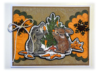 I am not normally a humongous House Mouse fan, but the Happy Hoppers do make me smile. It think it's their lack of little claws! I like how the Martha Stewart snowflakes on this card also remind me of the frilly foliage on the tops of carrots (I suppose you'd have to be a gardener to think of that, really...or a rabbit! ;)