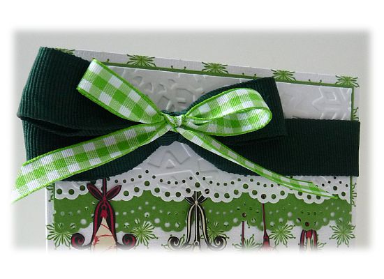 I attached the gingham-checked bow on top of the dark green one using a small sequin pin. It is snug and secure this way. The ornaments are cut out from scraps of the same sheet of paper used on my Believe Christmas card using an X-Acto blade; then I attached them at different 'heights' using 3D Zots: